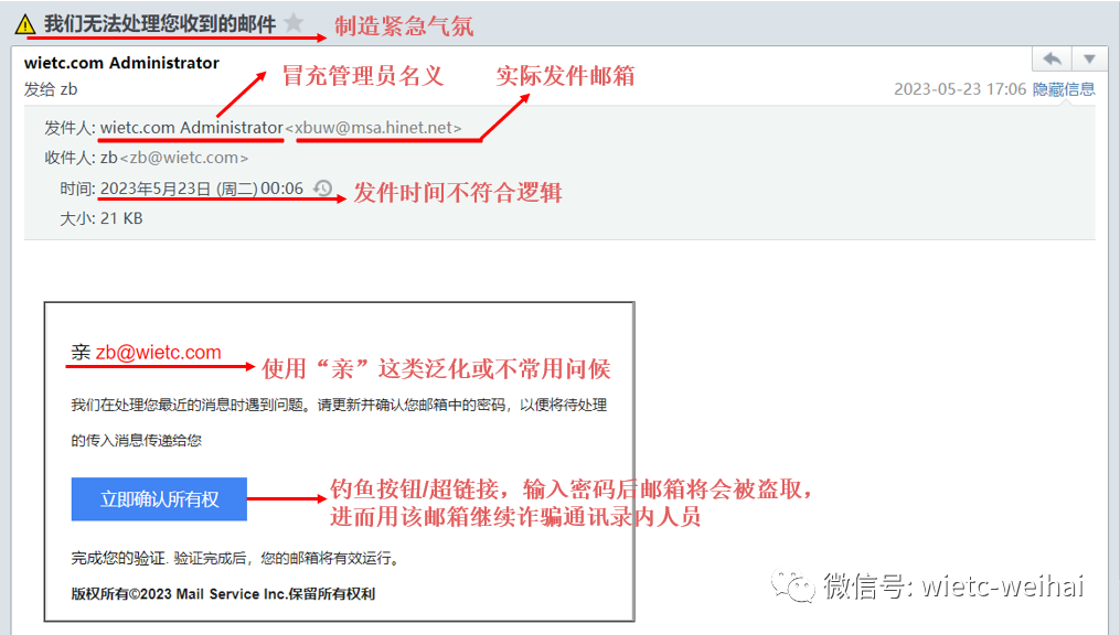 對(duì)使用“親愛的用戶”、“親愛的同事”等一些泛化問(wèn)候或同事間不常用稱呼的郵件應(yīng)保持警惕。同時(shí)也要對(duì)任何制造緊張氣氛的郵件提高警惕,如“賬號(hào)已到期”、“郵箱容量達(dá)到上限”等。